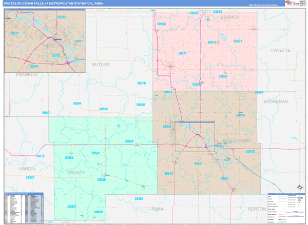 Waterloo Cedar Falls, IA Metro Area Wall Map Color Cast Style by