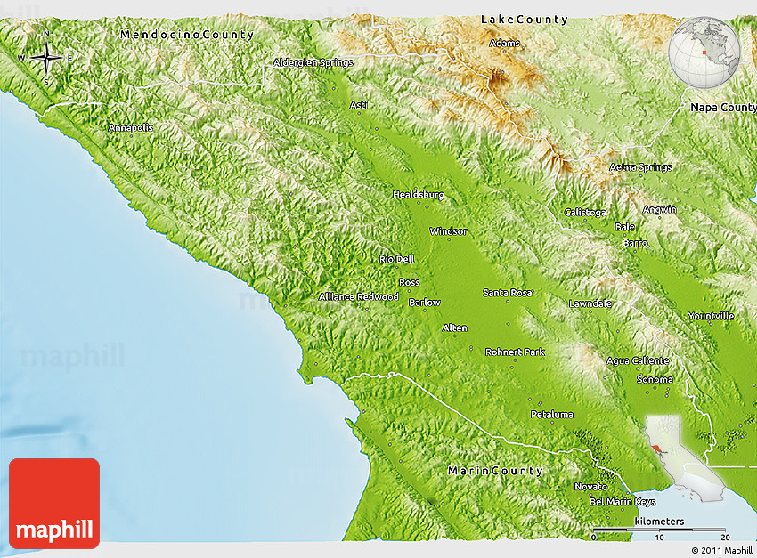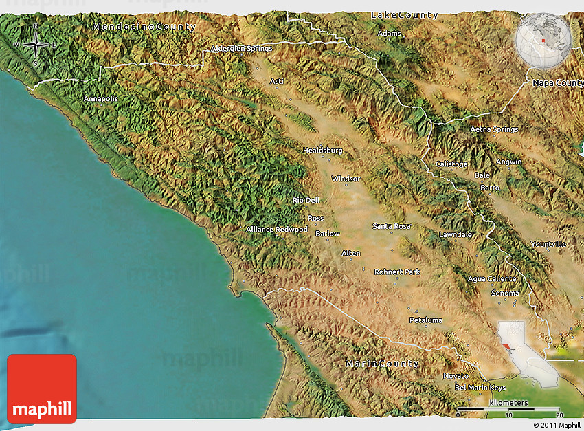 Physical Map of Sonoma County, shaded relief outside